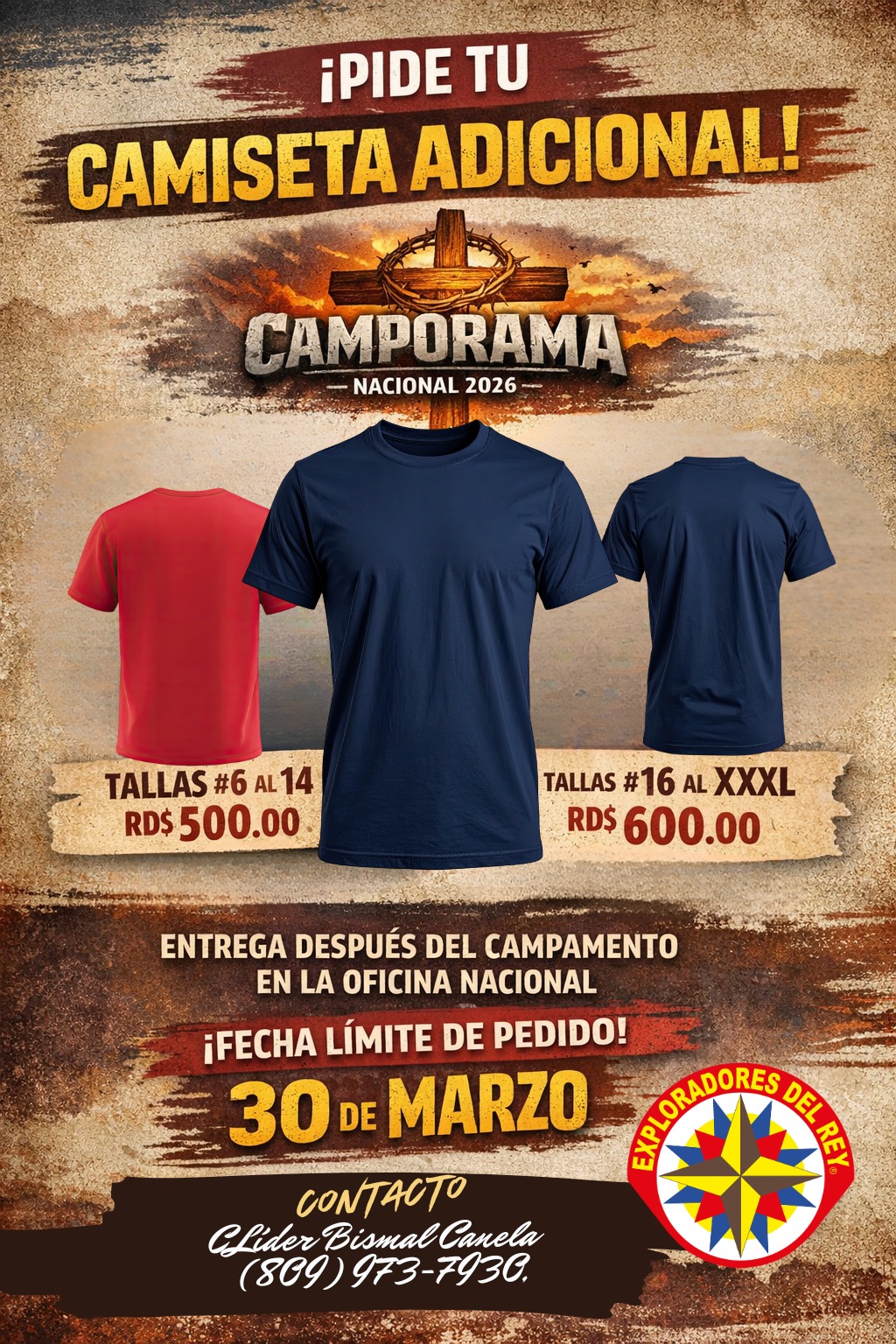 Ver mas📣 ¡Pide tus camisetas adicionales del campamento! Ya están disponibles los pedidos de camisetas adicionales del Camporama Nacional 2026 – SACRIFICIO. 👕 Precios por tallas: Del #6 al #14: RD$500.00 Del #16 al XXXL: RD$600.00 ⚠️ Importante:🚨🚨🚨🚨 La entrega de las camisetas adicionales será después del