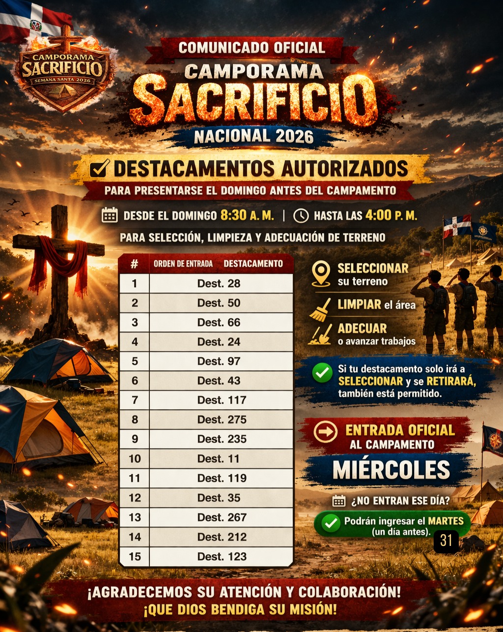Ver mas📢 COMUNICADO OFICIAL – CAMPORAMA SACRIFICIO NACIONAL 2026 Se informa a los siguientes destacamentos que estarán autorizados para presentarse el domingo antes del campamento, a partir de las 8:30 de la mañana, para realizar la selección de su terreno: Dest. 28 Dest. 50 Dest. 66 Dest.