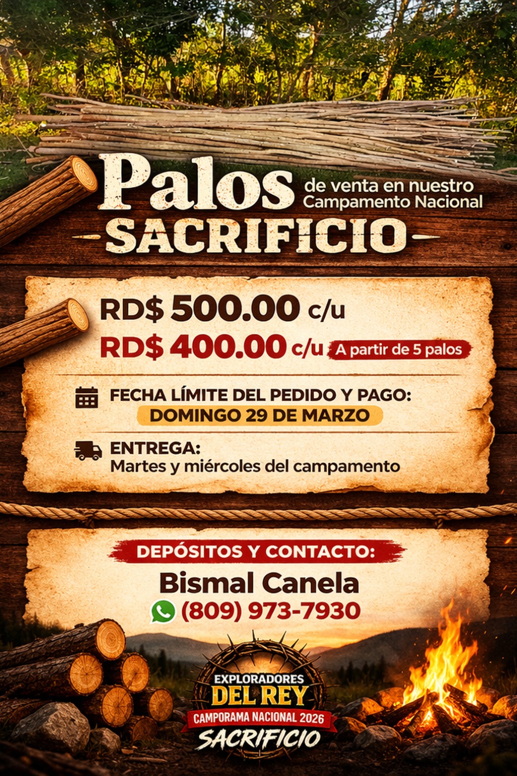 Ver mas🔥 ¡Palos disponibles para la venta en nuestro Campamento Nacional SACRIFICIO! 🪵 Aprovecha y realiza tu pedido con tiempo: ● RD$500.00 c/u ● RD$400.00 c/u a partir de 5 palos 📅 Fecha límite del pedido y pago: Domingo 29 de marzo 📍 Entrega: Martes y miércoles